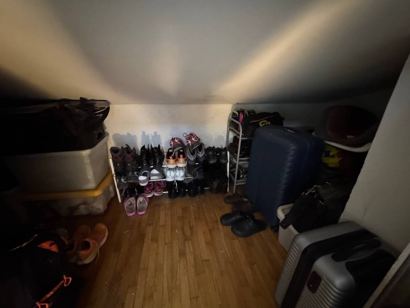 Ampia camera mansardata con finestra abbaino e comoda cabina armadio sotto tetto.